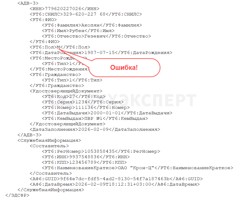 В ЗУП 3.1 есть ошибка – в файлах выгрузки АДВ-1, 2, 3 значение элемента Пол заполняется буквами М или Ж. А должно заполняться цифрами 1 или 2.