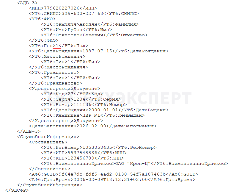 После установки патча созданную ранее форму нужно повторно провести. Тогда файл выгрузки сформируется в соответствии с утвержденным форматом – в теге <УТ6:Пол> заполнится цифра 1 или 2.